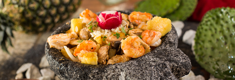 A sizzling volcanic bowl filled with grilled chicken, golden roasted, shrimp, pineapple, and grilled onions. Topped with our classic extra melt cheese and a homemade honey chile pasilla sauce. Served with rice, beans, tortillas and a shredded lettuce, pico de gallo, sour cream side salad.