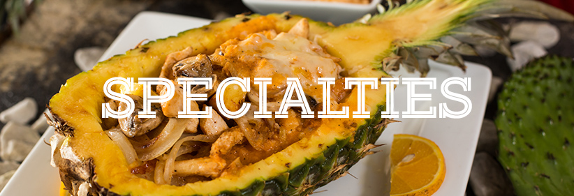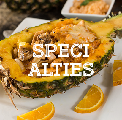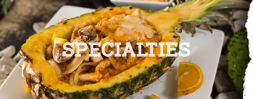 Half roasted pineapple filled with grilled chicken shrimp, caramelized pineapple chunks, grilled onions, and mushrooms. Topped with a homemade honey pasilla sauce and shredded cheese, served with a side of rice and tortillas.